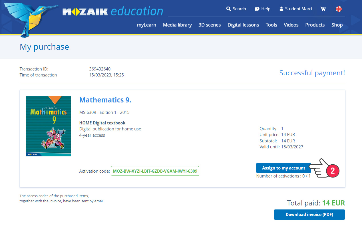 Prije upotrebe potrebno je izvršiti aktivaciju digitalnih izdanja, to jest, povezati ih sa svojim mozaWeb korisničkim računom. Ako ste knjigu kupili sebi, odmah ju, po obavljenoj kupovini, možete povezati sa svojim računom (2).