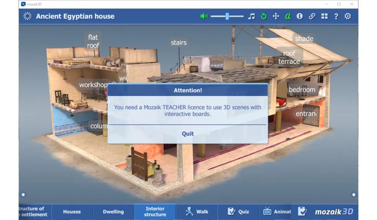 Naše 3D scene se mogu koristiti u obrazovne svrhe samo ako imate licencu za nastavnike (Mozaik TEACHER, ili mozaBook CLASSROOM). Pretpostavljamo da se koristi u obrazovne svrhe, ako je na računalo spojen projektor ili ekran s dijagonalom većom od 32" (npr.: interaktivna tabla)