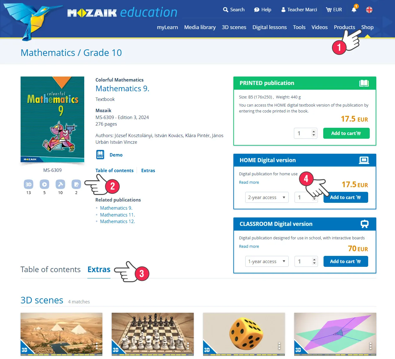 Na zaglavlju stranice, u izborniku, odaberite Trgovina/Udžbenici. Pronađite knjigu koju želite kupiti i kliknite na njezinu naslovnicu. Na idućoj stranici, ispod omota knjige, pojavit će se broj dodatnih sadržaja (1). Ako nastavite listati prema dolje, pojavit će se Tablica sadržaja i dodatci, uključeni u knjigu (2).