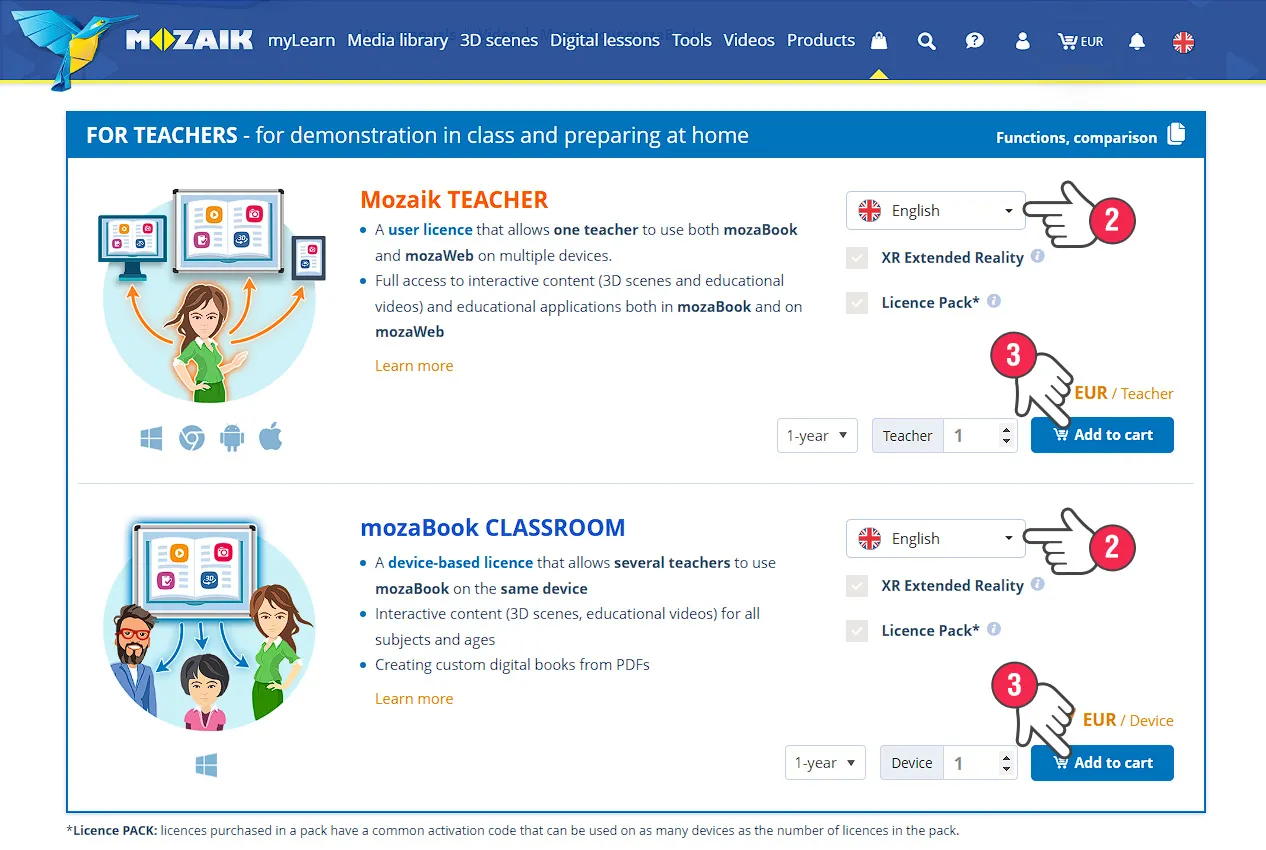 Na mozaBook stranici s informacijama možete birati između više vrsta licenci. Pročitajte što svaka od njih uključuje i odaberite onu koja vam najbolje odgovara. Zatim odaberite jezik programa (2) te ju dodajte u svoju košaricu (3). Ovdje pročitajte više vrstama licenci.